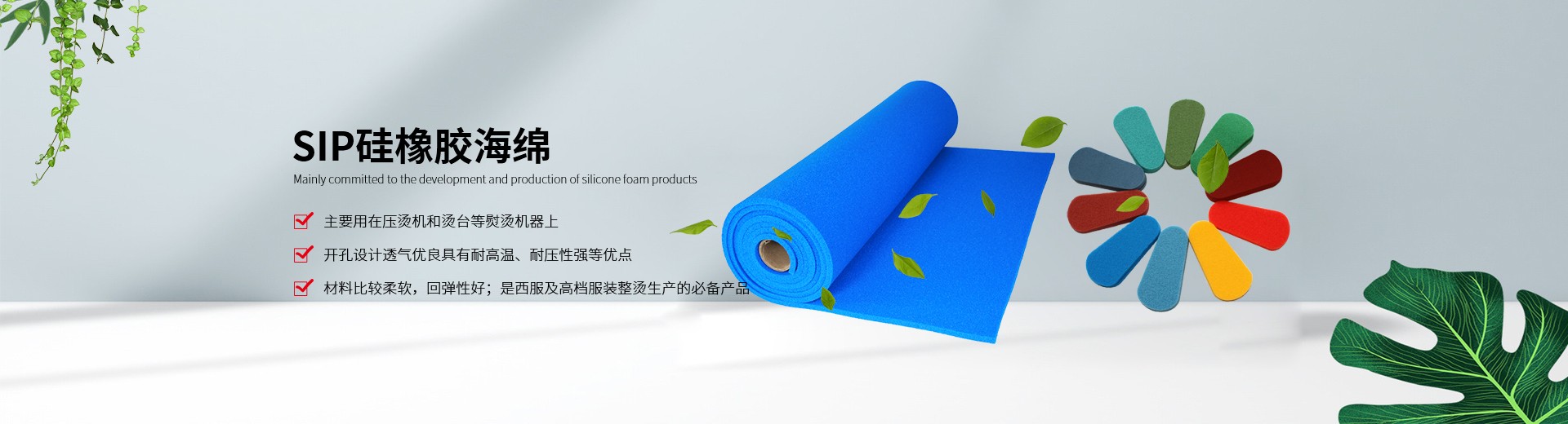 ????我公司生產(chǎn)的硅膠海綿具有耐高溫、耐壓、透氣性能好、抗撕拉、使用壽命長、環(huán)保等特點,主要適用于服裝干洗、水洗熨燙設(shè)備,如壓燙機和燙臺等。另外我們也提供各種燙氈、罩布等整燙專用墊料,客戶可根據(jù)不同熨燙工藝選擇不同的搭配組合,滿足高品質(zhì)的熨燙要求。